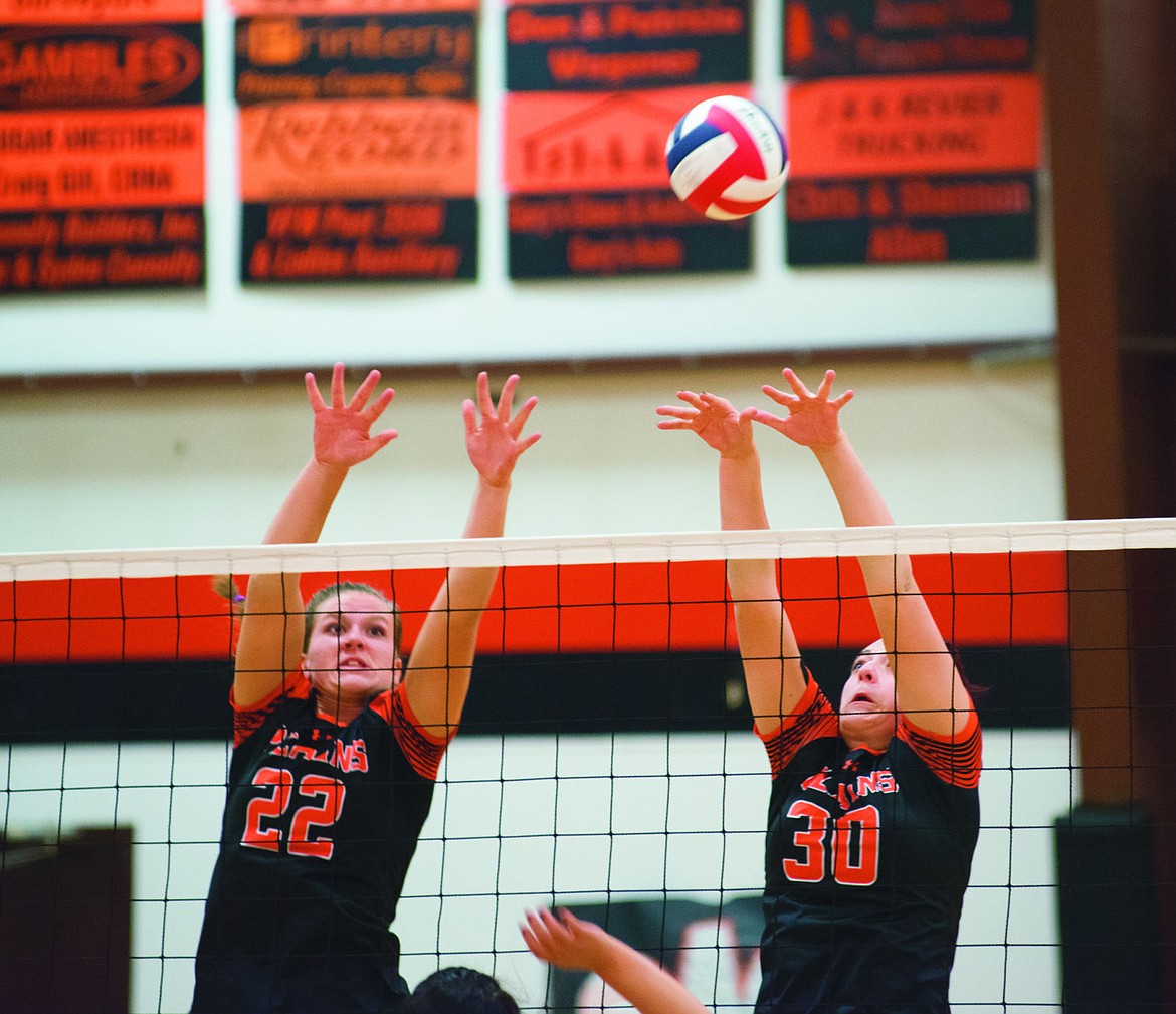 Leah Thompson, left, and Ronnie Black, right, jump to block a spike.
