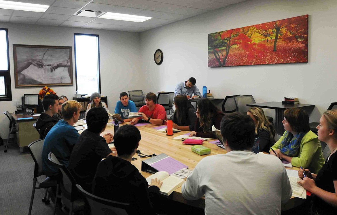 Students discuss with each other in Micah Tinkam's class in the new addition at Stillwater Christian on Friday. The classroom was designed to make it easy for the students to use the harkness method. (Aaric Bryan/Daily Inter Lake)