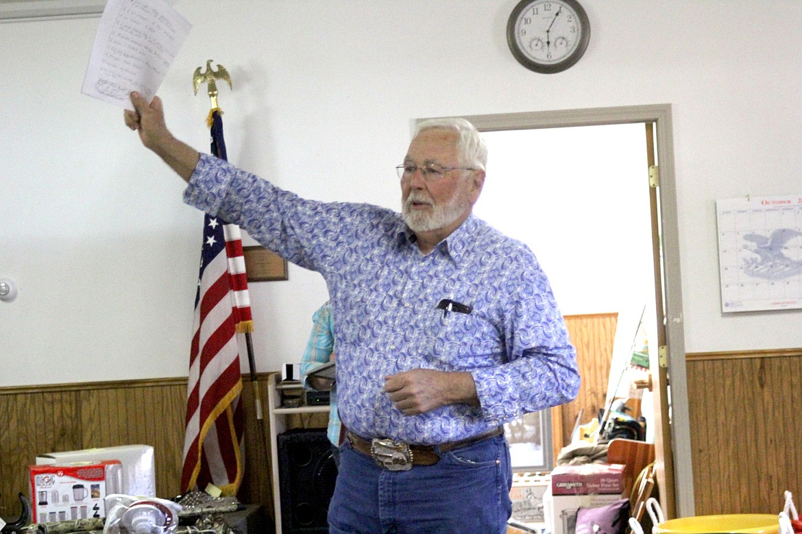 Jim Ellis describes one of the items he will auction off at the St. Regis Community Center during a benefit auction for a Tricon employee whose home was destroyed in a fire.