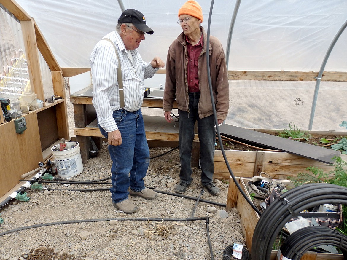 Charlie Stevens and Mason Henderson discuss vegetable crop production at Charlie's new seasonal high tunnel near St. Regis.