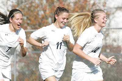 Annie Berget, center, is all smiles after scoring her second goal on the day vs. Bigfork Saturday. With Allie Coldwell, left, and Dani Hawthorne right. The girls went on to tie the Valkyries 4-4.