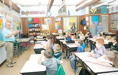 Third graders gathered in Mr. McBride's classroom Tuesday and heard presentations from Elks Club member Bob Malyevac (speaking) and Rotary Club member George Gerard about literacy and clean water respectively.