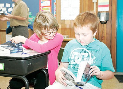 Third graders Sarah Watson, left, and Deagan Jaynes look over their new student dictionaries Tuesday at Libby Elementary.