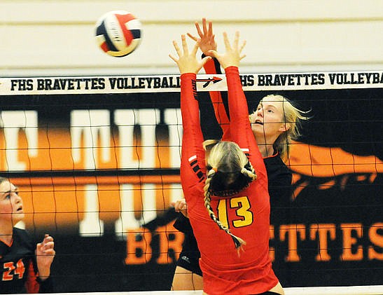 Flathead's Tiana Johnson knocks a kill past Missoula Hellgate's Erin Szalda-Petree during the second game of a Western AA match at Flathead on Tuesday, Oct. 13 in this file photo. (Aaric Bryan/Daily Inter Lake)
