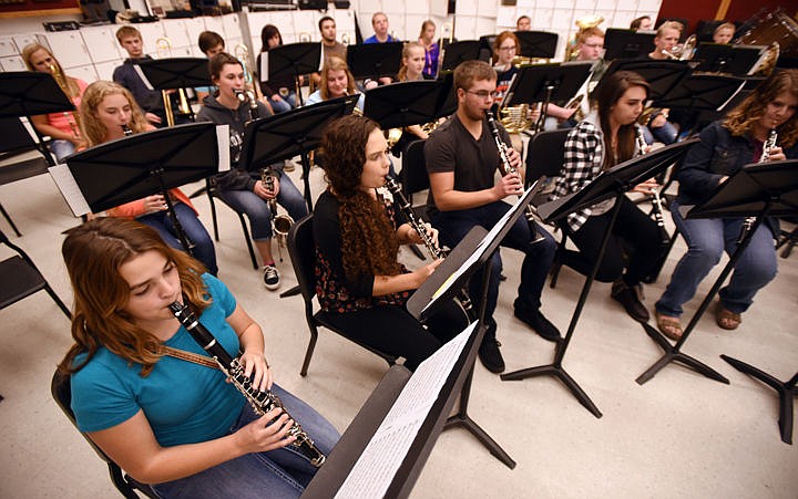 Emily Kern of Glacier plays clarinet at rehearsal with students from Glacier, Flathead, Whitefish, Columbia Falls and Bigfork on Monday, October 12, as they prepare for an upcoming performance with the members of Presidio Brass. The concert is scheduled for Monday, October 19 at 7:30 p.m. at Flathead High School. Beside Kern are Kendra Wilke, from Flathead, Mark Sletterink from Glacier, Jessica Lyles from Flathead and Jamie Davis from Glacier. (Brenda Ahearn/Daily Inter Lake)