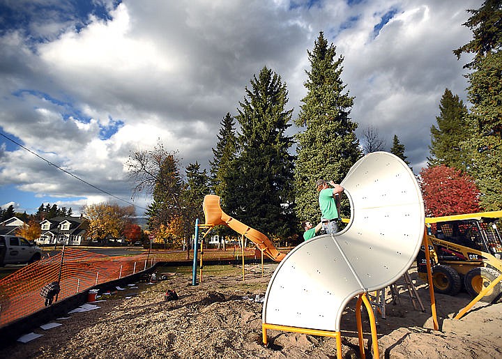 A crew from Playco Park Builders in Denver, Colorado install a new playground set at Memorial Park on Tuesday evening, October 13, in Whitefish. According to Director of Whitefish Parks and Recreation Maria Butts the old playground was in a state of disrepair and needed to be replaced. "This park is being built from resort tax dollars," said Butts. "Anytime people buy local in Whitefish they support community parks." The park construction is going well and Butts expects the new playground to be open to the public by the end of the month. (Brenda Ahearn/Daily Inter Lake)