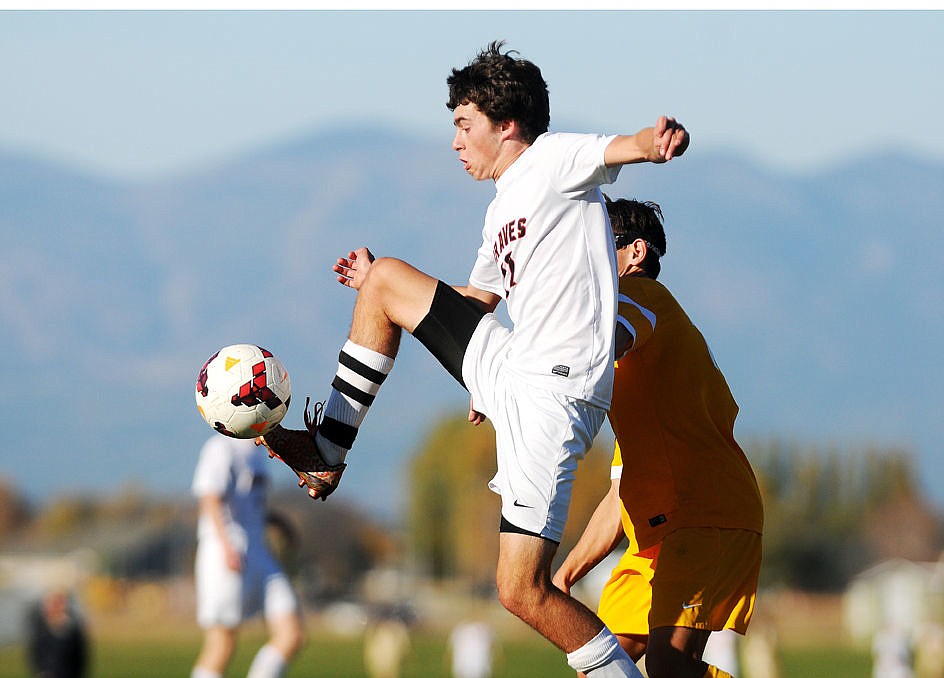 Flathead's Jace Darrow leaps in front of Helena Capital's William Stukaloff to get a ball during an 0-0 draw on Thursday. (Aaric Bryan/Daily Inter Lake)