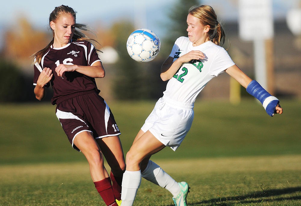 Glacier's Cadie Williams blocks Helena's Cailyn Wall's kick during the first half at Glacier on Thursday. (Aaric Bryan/Daily Inter Lake)
