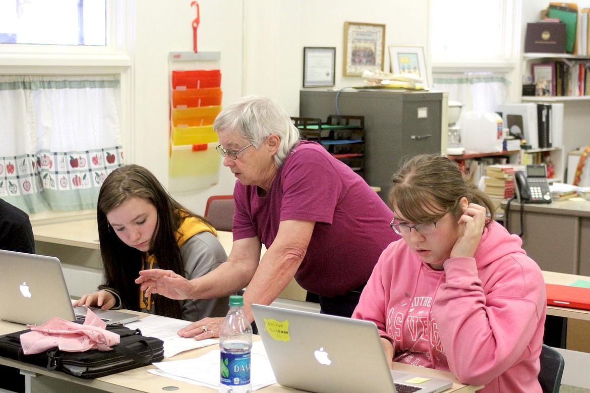 Kayli Schoolcraft, Judy Seemann, and Emily Coleman look up ancestral records online during a geneology exercise at Superior High School.