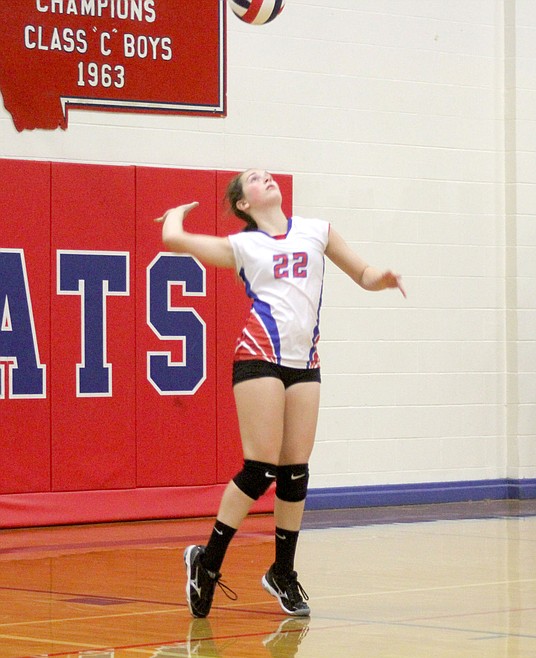 Madison Mask serves the ball across the net to Arlee during a Lady Bobcats home game.