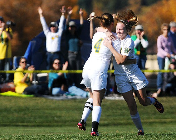 Whitefish's Cassidy Grady (4) and Katie Blankenship celebrate after Blankenship tied the game against Frenchtown. (Aaric Bryan/Daily Inter Lake)