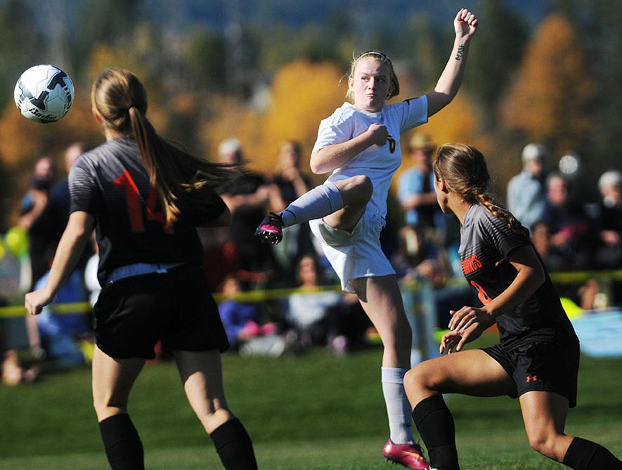 Whitefish's Katie Blankenship knocks in the ball to tie the score at 2-2 early in the second half against Frenchtown on Saturday. (Aaric Bryan/Daily Inter Lake)