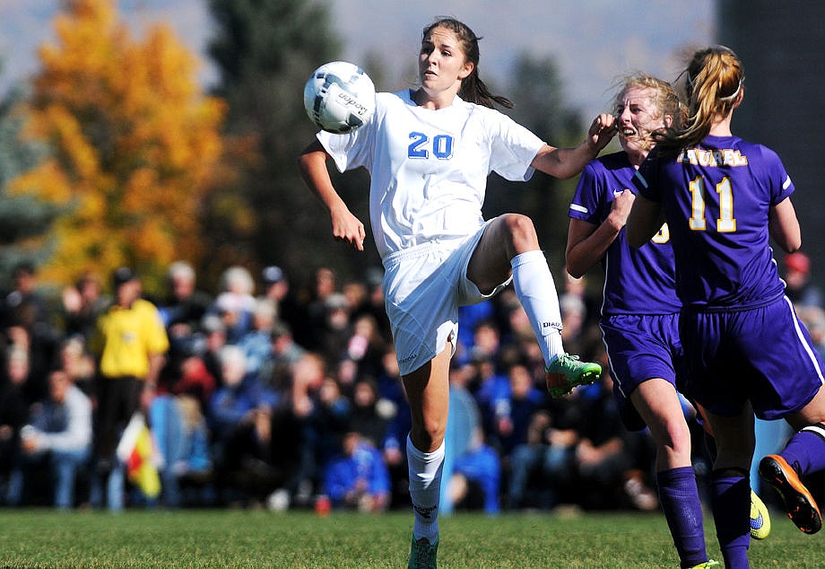 Columbia Falls' Hannah Gedlaman attempts to deflect the ball in during the second half of the Wildkats 3-1 loss to the Laurel Locomotives in Columbia Falls on Saturday. (Aaric Bryan/Daily Inter Lake)