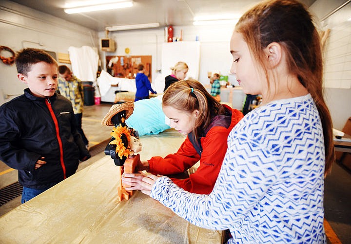 From left: Trent Massey, Emma Gambino Cecelia Wink, and other fifth graders in Jackie Robbins class, help decorate tables at the Creston Fire station on Monday afternoon, October 19, in preparation for the 8th Annual Soup for Supper Fall Fundraiser. The fundraiser begins today at 3:30 and will feature 21 different soups and chowders from the Creston Firefighters Associated Membership. In 2014 the fundraiser had more than 400 people attend and raised over $6000 which is used for training and education of the firefighters. (Brenda Ahearn/Daily Inter Lake)