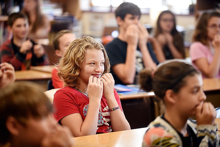 On Tuesday, Gladstone stood in front of a group of seventh-graders in Jennie Cumbane’s Montana History class. Gladstone raised her hands to sign a song called “Birds and People” as Halladay Quist strummed her guitar and sang while the students did their best to follow along.