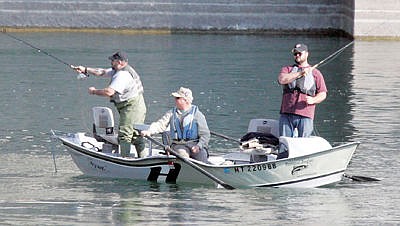 Randall Vallee, left, Dave Blackburn and Joe Wright fishing below Libby Dam Saturday, Oct. 17.