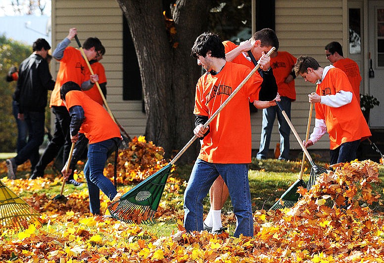 The Flathead High School Varsity Men's Choir rakes a yard for Service Day on Thursday. (Aaric Bryan/Daily Inter Lake)
