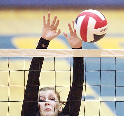 Junior Allie Brown blocking in third game vs. Libby Oct. 20. Libby in three: 21-25, 25-17, 25-20, 28-26.
