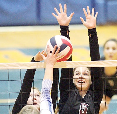 Allie Brown, left, and Jessica Ward blocking first game vs. Libby Oct. 20. Libby in four: 21-25, 25-17, 25-20, 28-26.