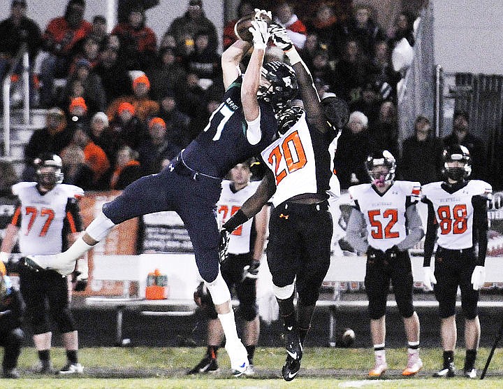 Glaicier's Noah Lindsay hauls in a catch as Flathead's Nate Sommers attempts to break it up at Legends Stadium on Friday, Oct. 23, 2015. (Aaric Bryan/Daily Inter Lake)