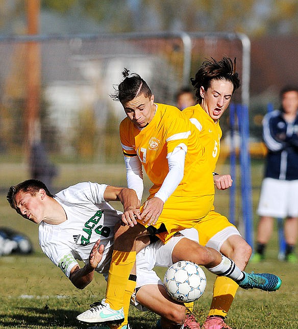 Troy's Scott Pate crashes into the pit during the long jump at the Class B state track and field championship in Kalispell on Friday. Pate finished in second with a jump of 20 feet, 11.5 inches. (Aaric Bryan/Daily Inter Lake)
