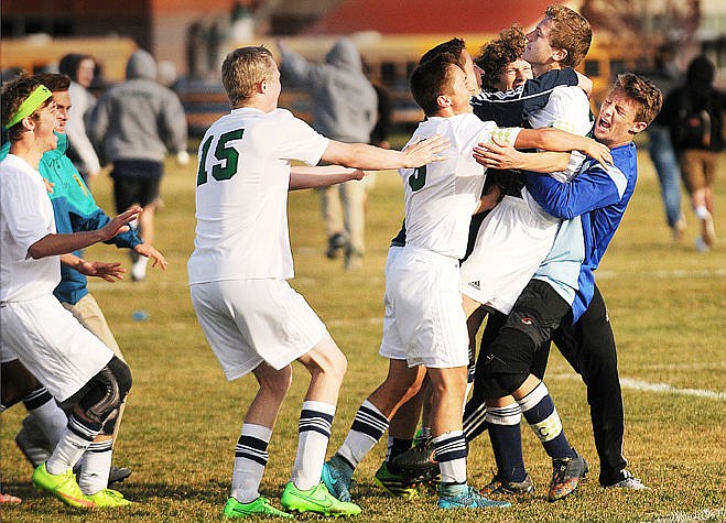 The Wolfpack rush to congratulate Ben Wright after he scored the winning goal in the shootout to beat Helena Capital and advance to the state tournament. (Aaric Bryan/Daily Inter Lake)
