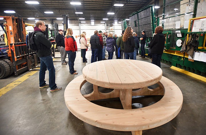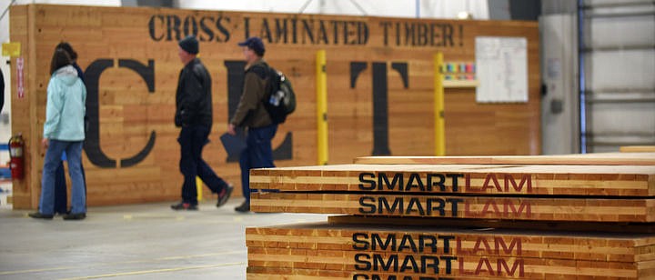 Earlier, the timber tour visited the SmartLam facility in Columbia Falls. SmartLam is the only facility in the United States that produces cross-laminated timber; two have also popped up in Canada. Kalispell Chamber of Commerce President Joe Unterreiner led about 60 people into the 40,000-square-foot Smart Lam facility while production had halted.