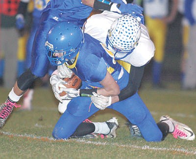 Pass complete to junior Erik Lauer for a first down first quarter vs. Thompson Falls Oct. 23. Trais Hoisington on the tackle.