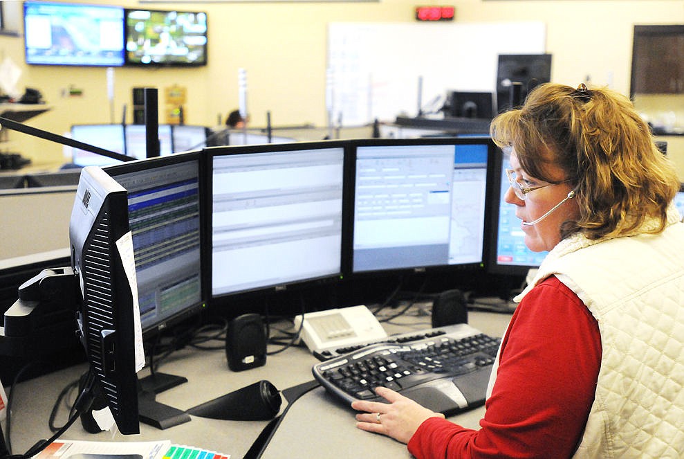 Faith Pierson takes a call at the Flathead 911 Emergency Communications Center on Wednesday. (Aaric Bryan/Daily Inter Lake)