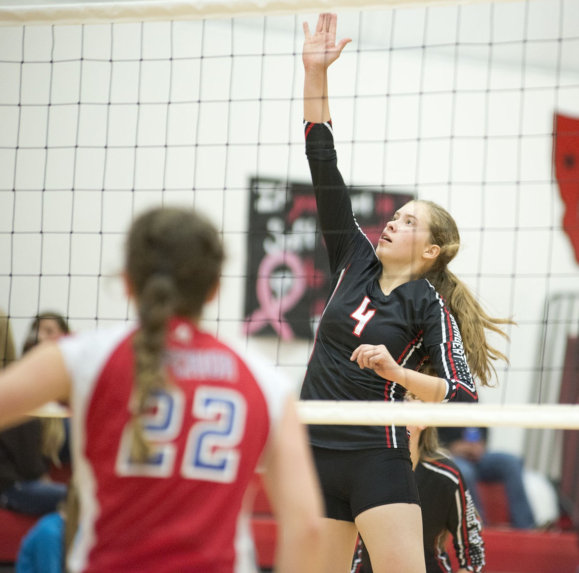 Lexie DeTienne spikes the ball against Superior, Saturday night.