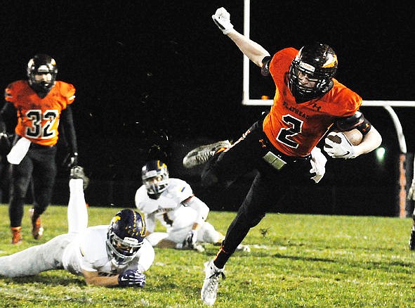 Flathead's Seth Adolph breaks a tackle as he carries the ball for a first down during the Braves' opening, scoring-drive against Missoula Sentinel at Legends Stadium on Oct. 30, 2015. (Aaric Bryan/Daily Inter Lake)