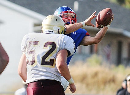 Troy's Scott Pate crashes into the pit during the long jump at the Class B state track and field championship in Kalispell on Friday. Pate finished in second with a jump of 20 feet, 11.5 inches. (Aaric Bryan/Daily Inter Lake)