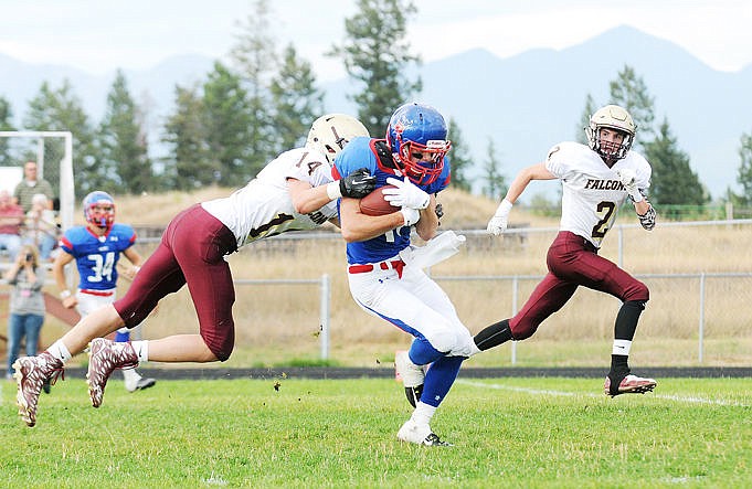 Troy's Scott Pate crashes into the pit during the long jump at the Class B state track and field championship in Kalispell on Friday. Pate finished in second with a jump of 20 feet, 11.5 inches. (Aaric Bryan/Daily Inter Lake)