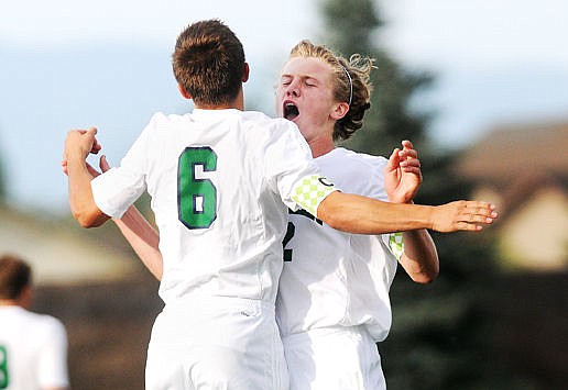 Colton Becker, 6, is celebrates with Ben Wright after Becker scored in the opening minutes against Missoula Sentinel at Glacier on Tuesday. (Aaric Bryan/Daily Inter Lake)