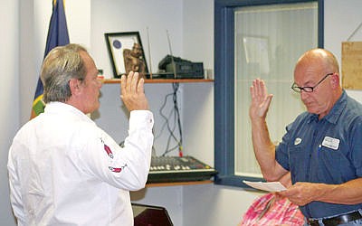 Gary Neff, left, sworn in as a Libby City Councilman by Mayor Doug Roll Aug. 31, 2015.