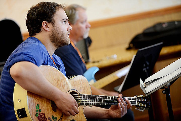 Local musician Colten Christensen listens to Jared Meeker during his Personalize Rock and Blues class at the Crown of the Continent Guitar Workshop on Tuesday, September 1, in Bigfork. (Brenda Ahearn/Daily Inter Lake)