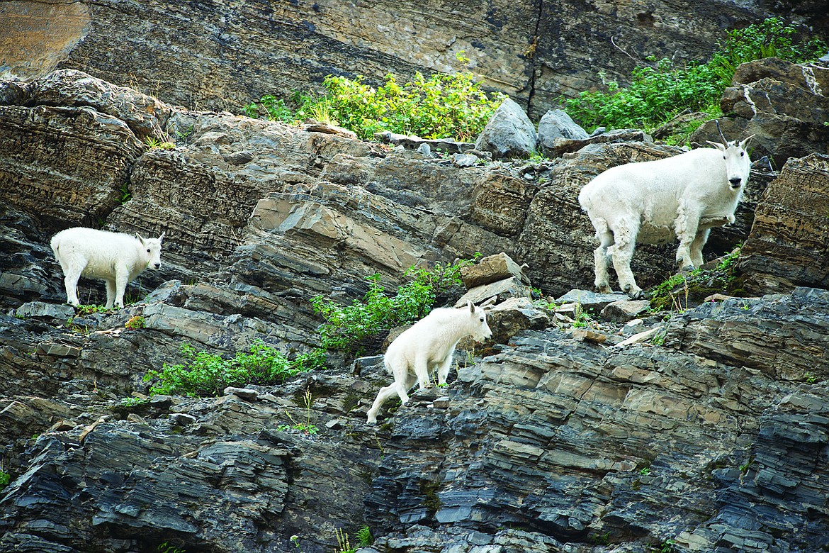 A nanny goat and her kids feed in Glacier National Park.