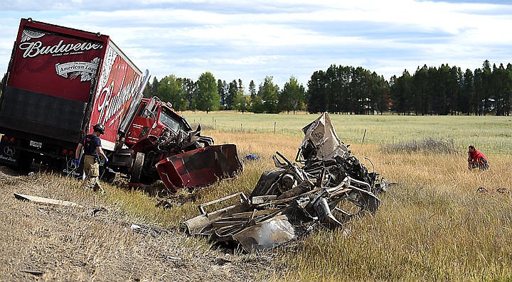 The driver of a Budweiser truck takes a moment off to the side of an accident scene Wednesday afternoon. The semi-trailer collided with a Ford F-250 pickup truck at the intersection of U.S. 93 and Farm-to-Market Road northwest of Whitefish. (Brenda Ahearn photos/Daily Inter Lake)