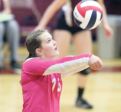 Kaitlyn Downey passing on a dig from Tana Thill first game vs. Stillwater Christian Cougars. Lady Trojans in three: 25-21, 25-20, 25-21.