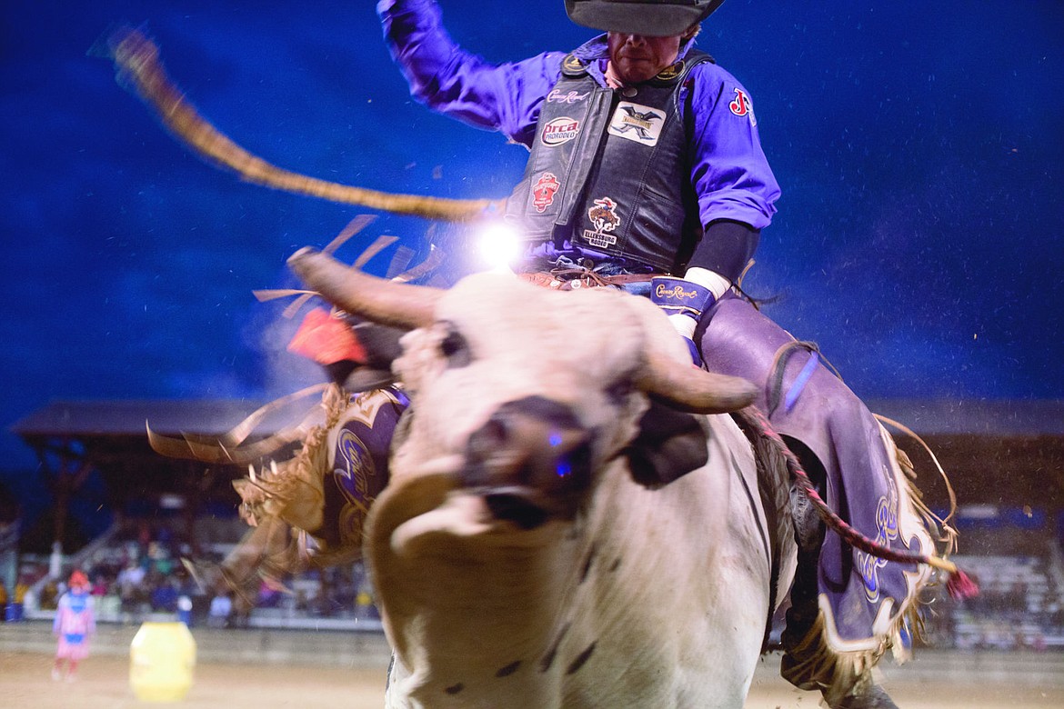 A bull rider rides during the Bullorama, Thursday evening during the Sanders County Fair.