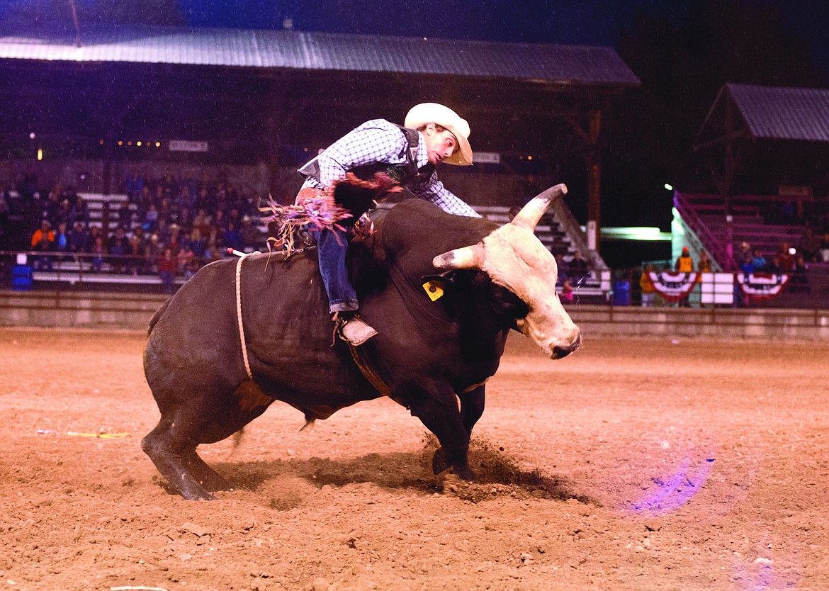 A bull rider goes for the eight seconds.
