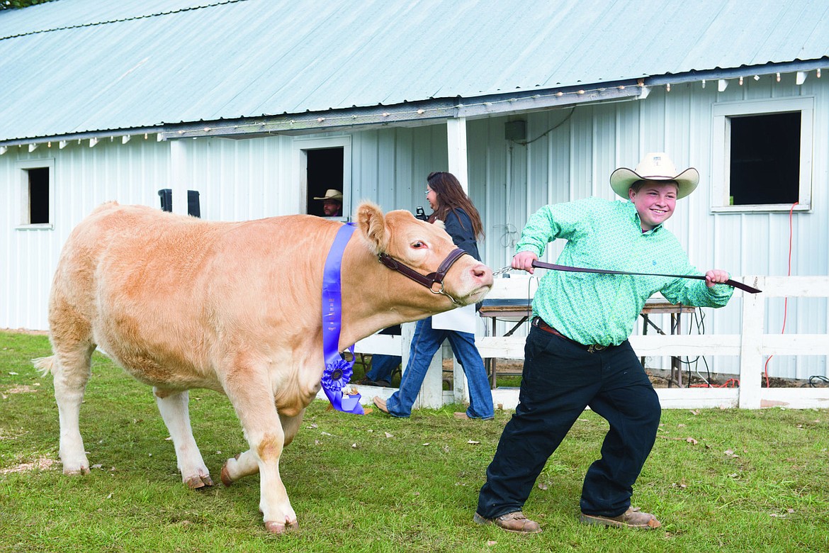 Coby Guenzler pulls his "Grand Champion Market Beef" cow out for bidders during the 4-H Sale.