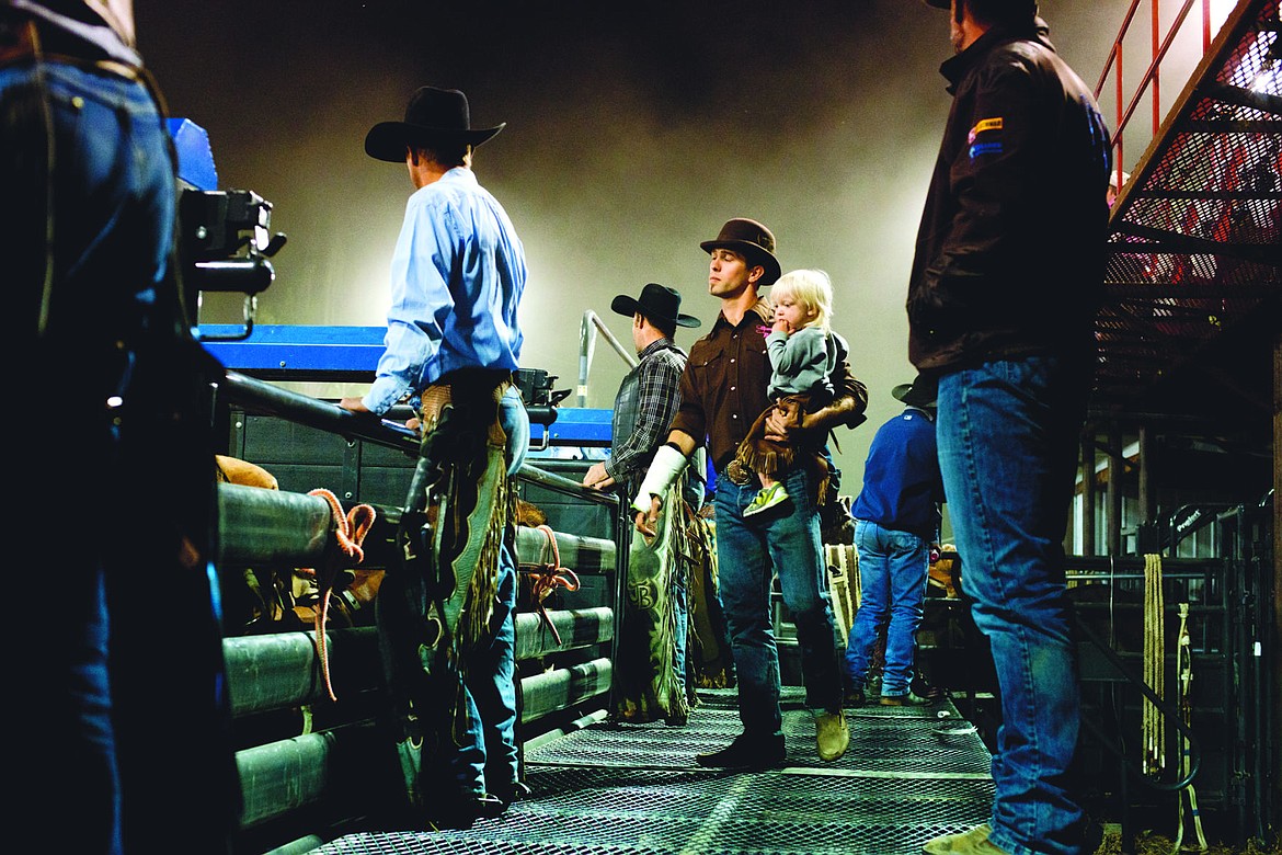 A father carries his son along the chutes Friday evening during the PRCA Rodeo.