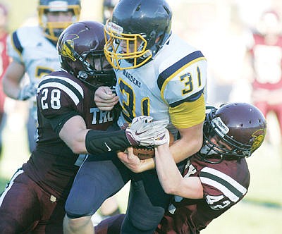 Conner Quiring and Trinity Rice go high and low tackling Mitchel Odden first quarter vs. Deer Lodge Sept. 11.