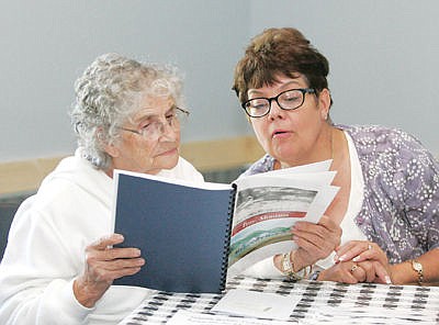 Myrtle Anderson, left, and Janeen Larson studying the history of Troy Saturday in the grand room of the Silver Spur.