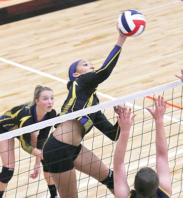 Kylie Richter/ Lake County Leader Libby's Mehki Sykes spikes the ball over a Deer Lodge defender on Saturday in Ronan.