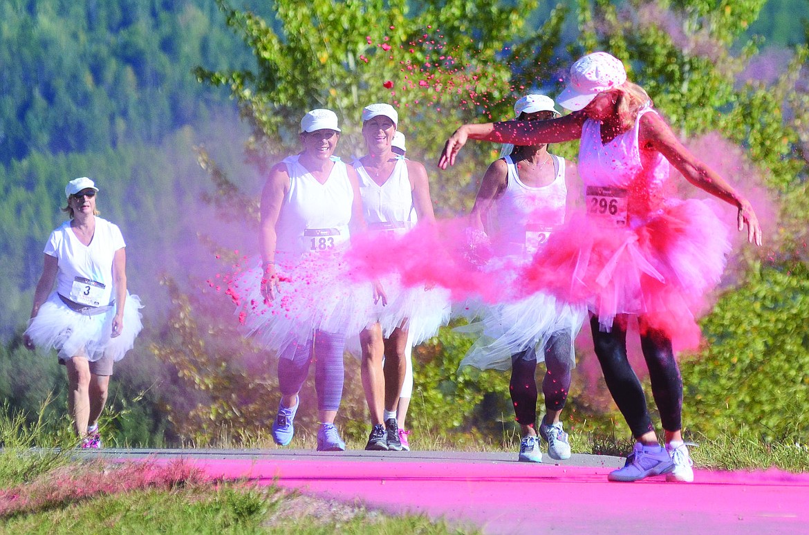 Suzette Wilke of Redwood City, Calif., leads a bridal party in the Great Fish 5K Color Run on Saturday. (Matt Baldwin/Whitefish Pilot)