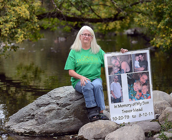 Denise McDonald poses Monday with a sign she made in memory of her son, Trevor Mead, who took his own life in 2011. The Flathead Valley Out of Darkness Walk is Sunday at Rebecca Farm west of Kalispell. (Brenda Ahearn/Daily Inter Lake)