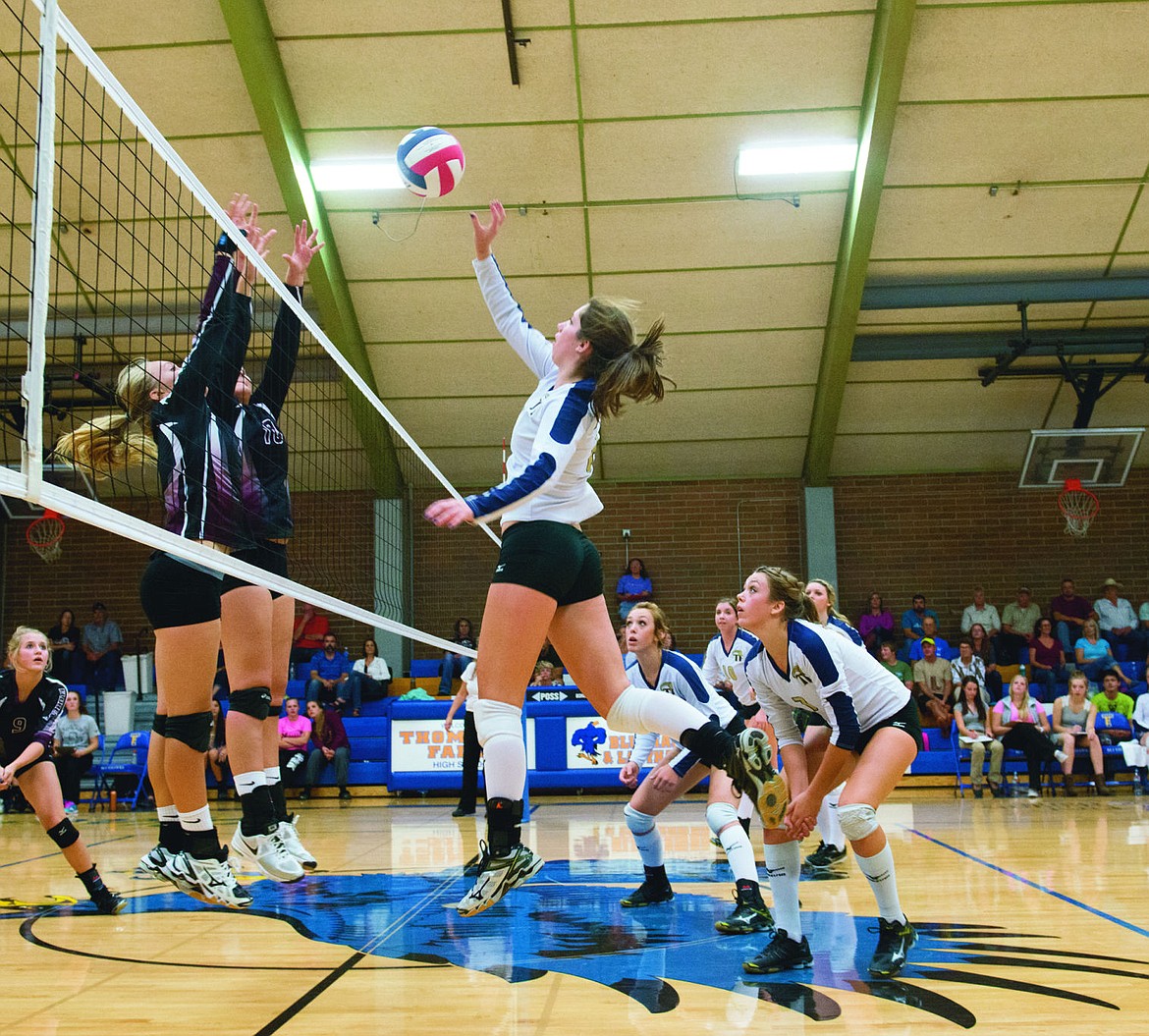 Madison Wheeler spikes the ball against the Florence Falcons, Thursday evening.