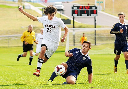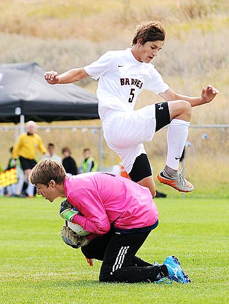 <p>Flathead's Jace Darrow jumps over the tackle attempt of Big Sky's Rylan Compton during the first half on Tuesday. (Aaric Bryan/Daily Inter Lake)</p>